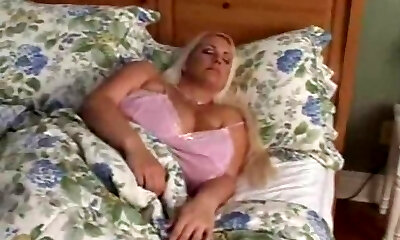 Insatiable, blonde granny is playing with her tits and her lovers knob, in the kitchen